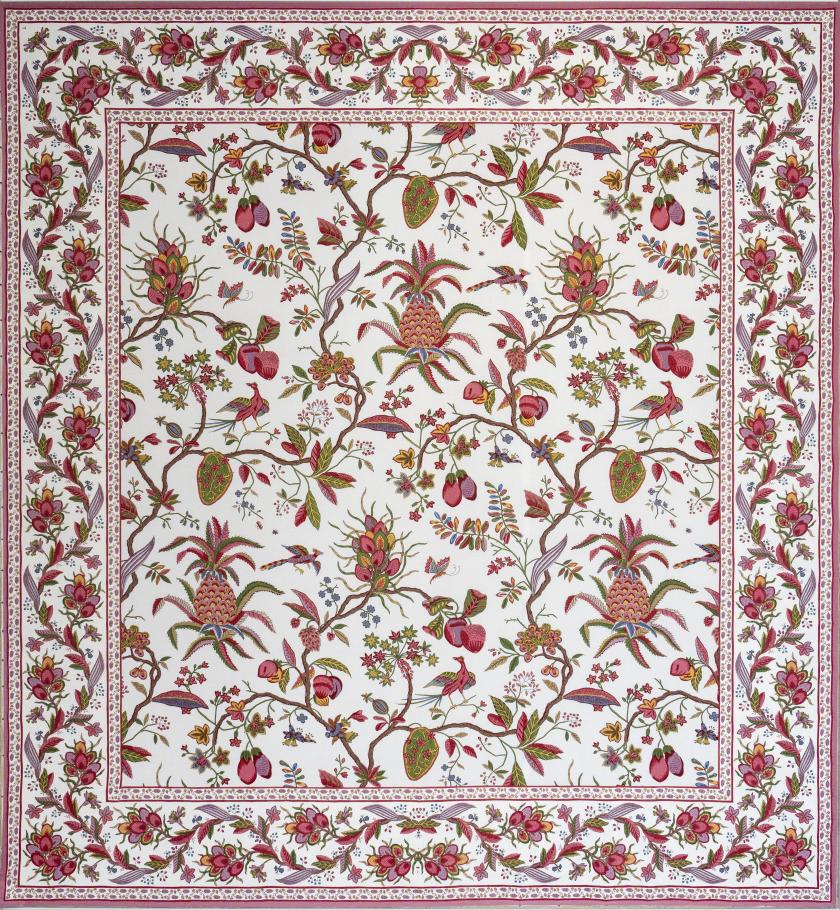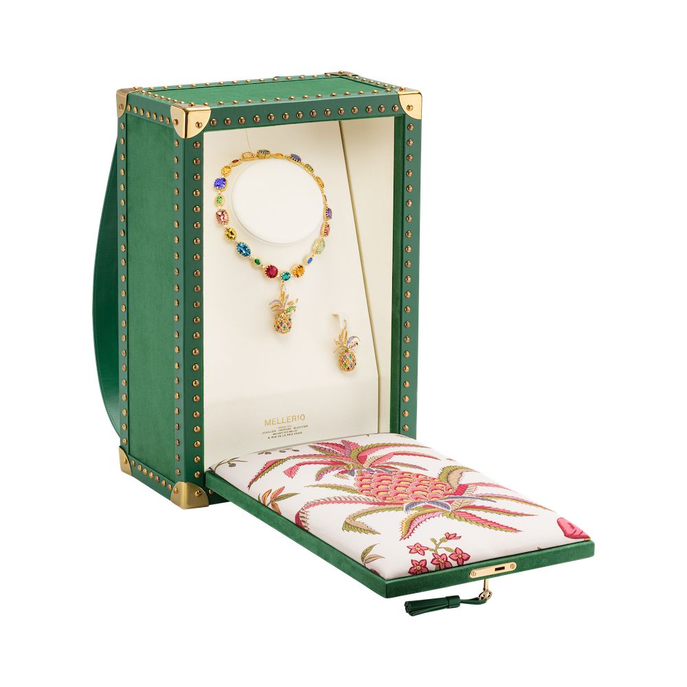 Inspirée par cette reine au goût raffiné et à l’esprit souvent joyeux et libre, Laure-Isabelle Mellerio a souhaité lui rendre hommage. Elle a transposé en joaillerie le jardin somptueux représenté sur la tenture au motif « Grand Ananas » des cabinets intérieurs de ses petits appartements à Versailles. Rien n’était trop beau pour Marie-Antoinette. L’ananas, motif original de la tenture et magnifié dans le tableau du peintre Oudry exposé dans ces petits appartements, symbolise la puissance royale : il était considéré comme le « Roi des fruits ». La beauté de la composition colorée liée à l’exotisme a profondément touché la directrice artistique de Mellerio, une maison réputée pour son amour de la nature et son expertise des pierres de couleur.