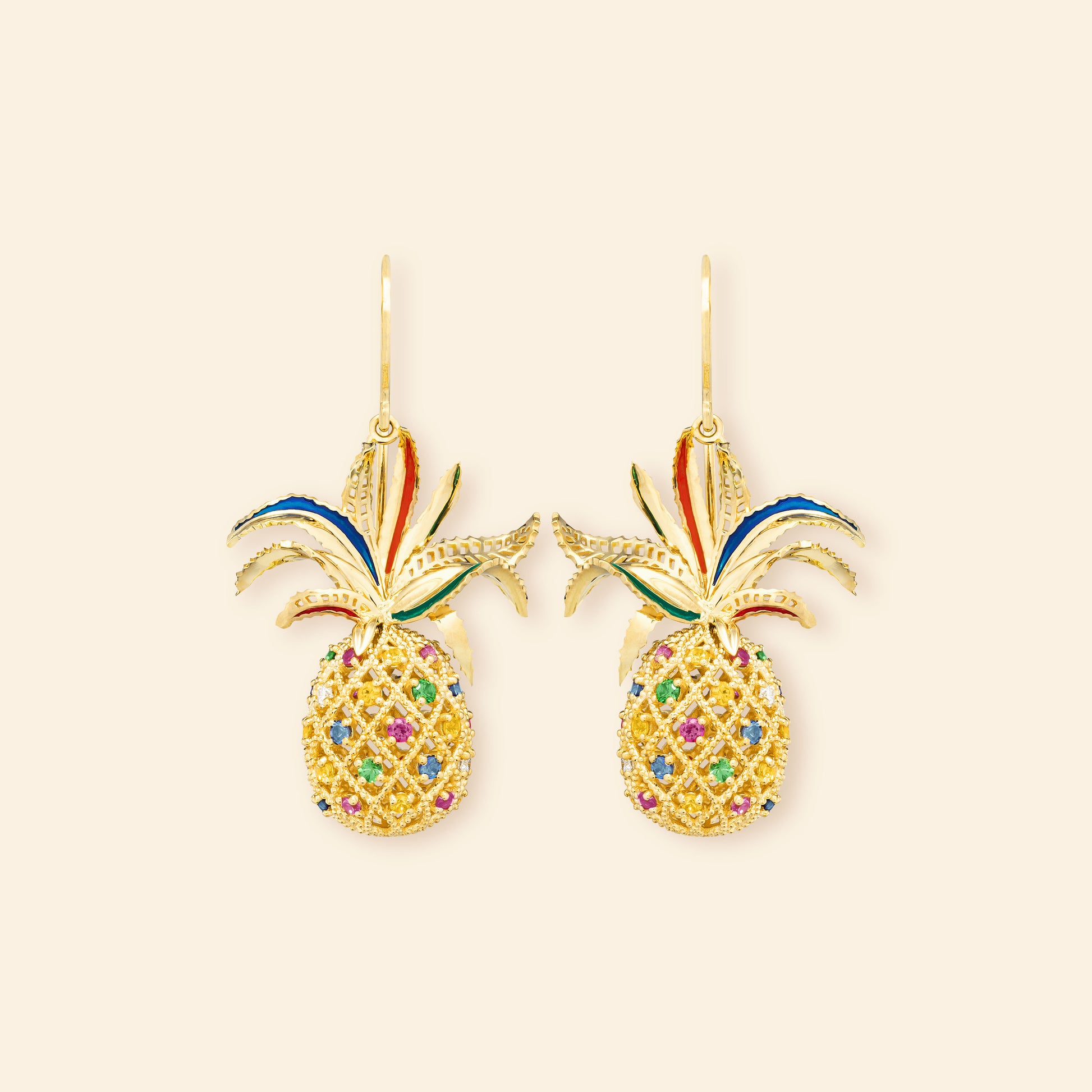 Boucles d'Oreilles* Ananas en or jaune 18k, sertie de : 12 Diamants (0,281ct), 14 Rubis (0,35ct), 16 Saphirs (0,43ct), 12 Saphirs jaunes (0,25ct), 12 Saphirs oranges (0,34ct), 6 Saphirs roses (0,12ct), 2 Saphirs violets (0,03ct), 6 Tsavorites (0,14ct), 80 Total général (1,941ct)**.