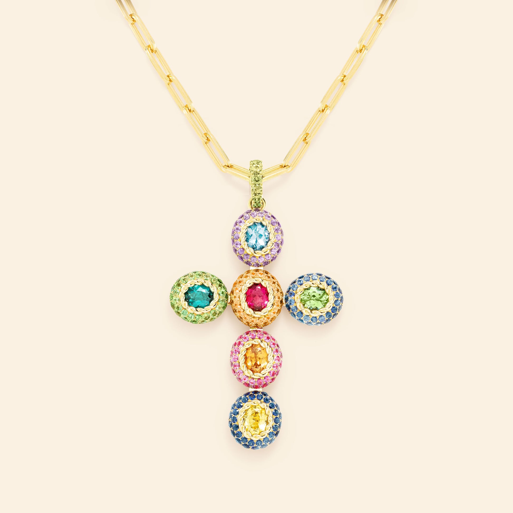 Croix Color Queen en or jaune 18k sertie de Spessartites, saphirs roses, Grenats Mint, Saphirs, Indigolite, Aigue-Marine, Saphirs violets, Rubellite, Saphir jaune, Saphirs.