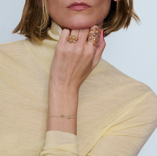Déclinée en bagues, colliers, bracelets et studs, cette ligne précieuse capture la beauté fugace de cette éclosion rare. Son motif sculpté autour du pistil révèle un jeu de lumière subtil, magnifié par l’éclat des diamants, des saphirs bleus et des tsavorites vertes.