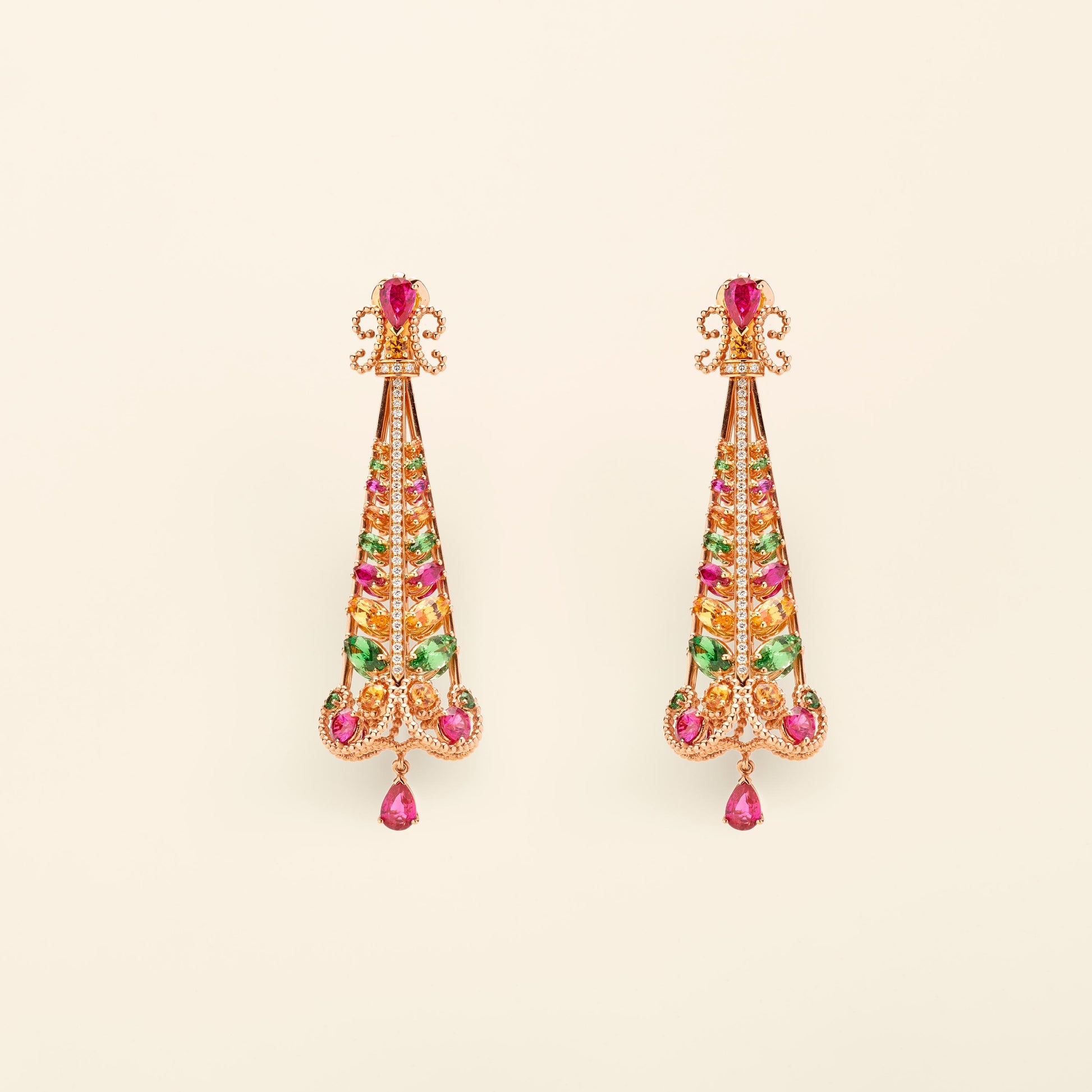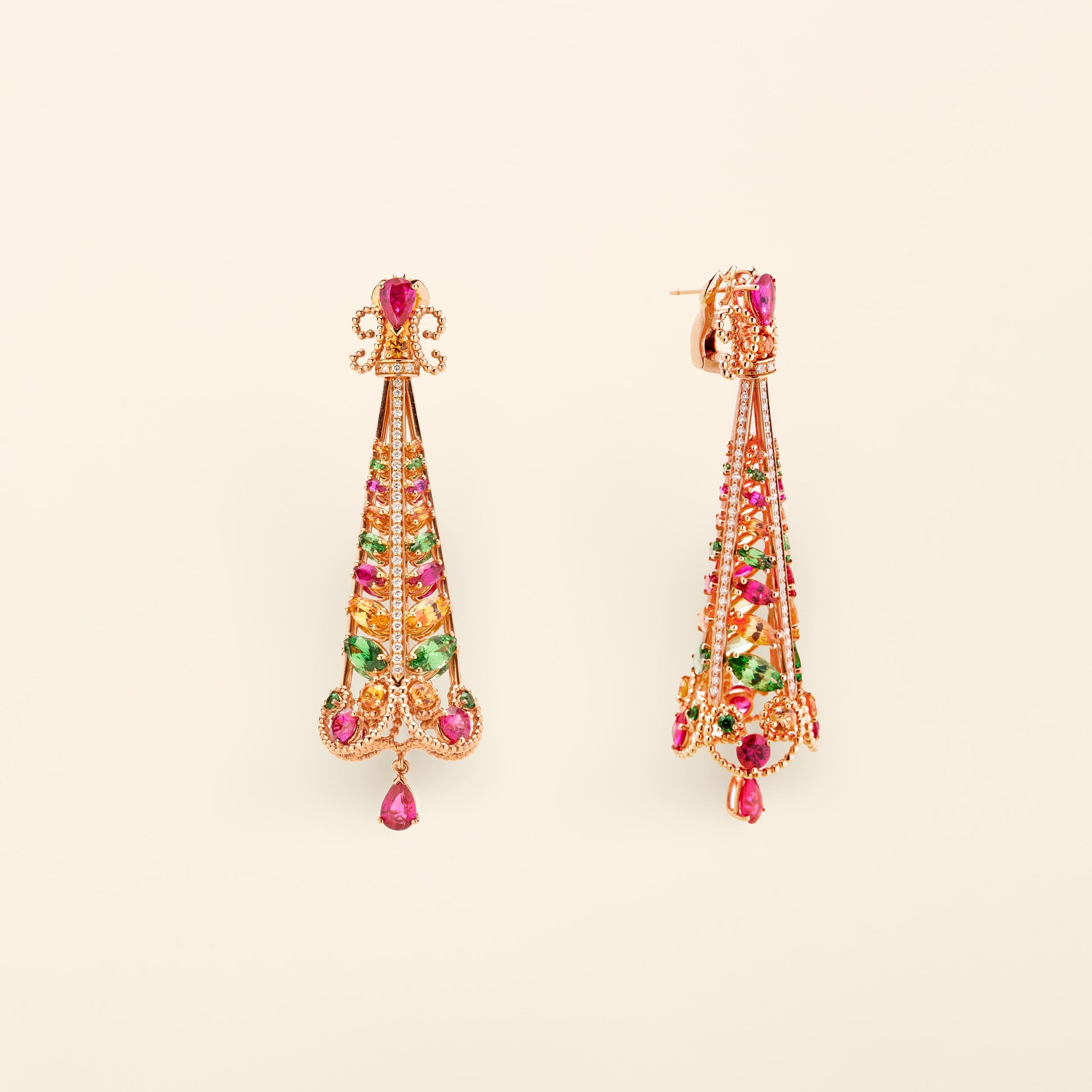 Boucles d'oreilles Milleriora, de la collection Isola Belle, en or rose 18k serties de saphirs roses, tsavorites, grenats spessartites et diamants.