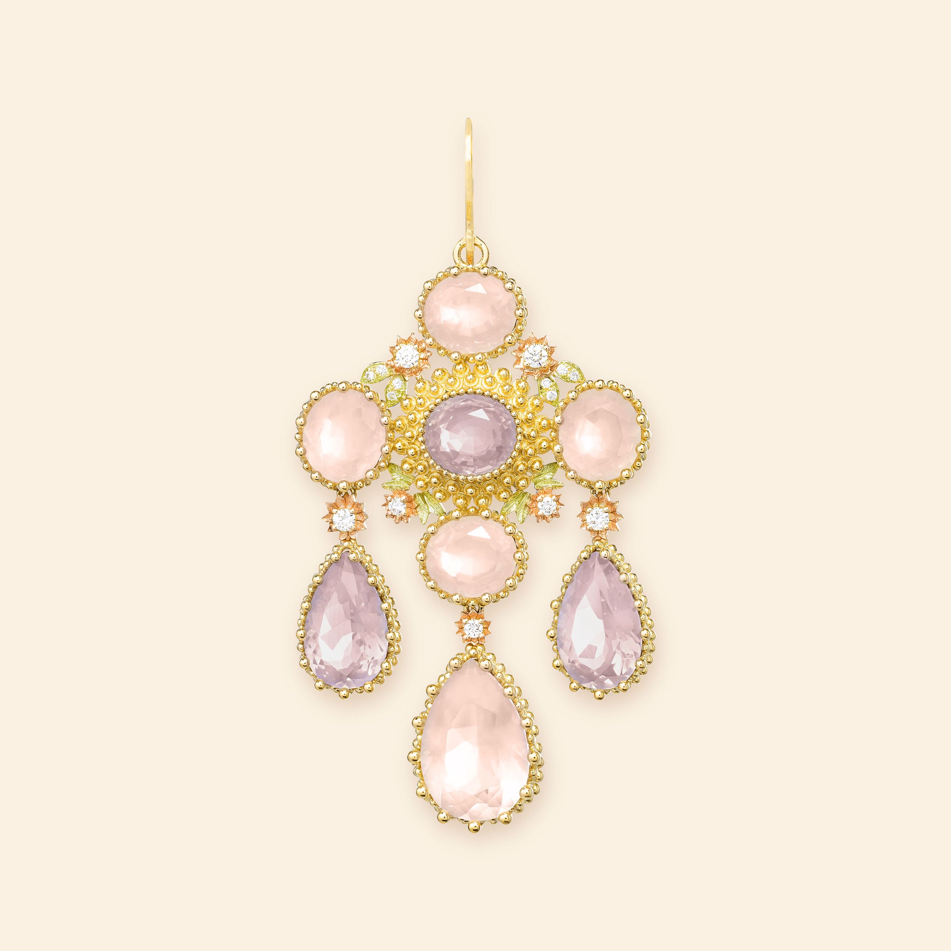 Boucle d'oreille* Girandole Pierreries Rose en or jaune 18k sertie de : 1 quartz rose taille poire (4,94cts), 2 quartz lavande taille poire (5,76cts), 4 quartz roses taille ovale (8,55cts), 1 quartz lavande taille ovale (2,17cts), 15 diamants (0,24ct)**, fleurs en or rose 18k et feuilles en or vert 18k, système col de cygne en or jaune 18k.