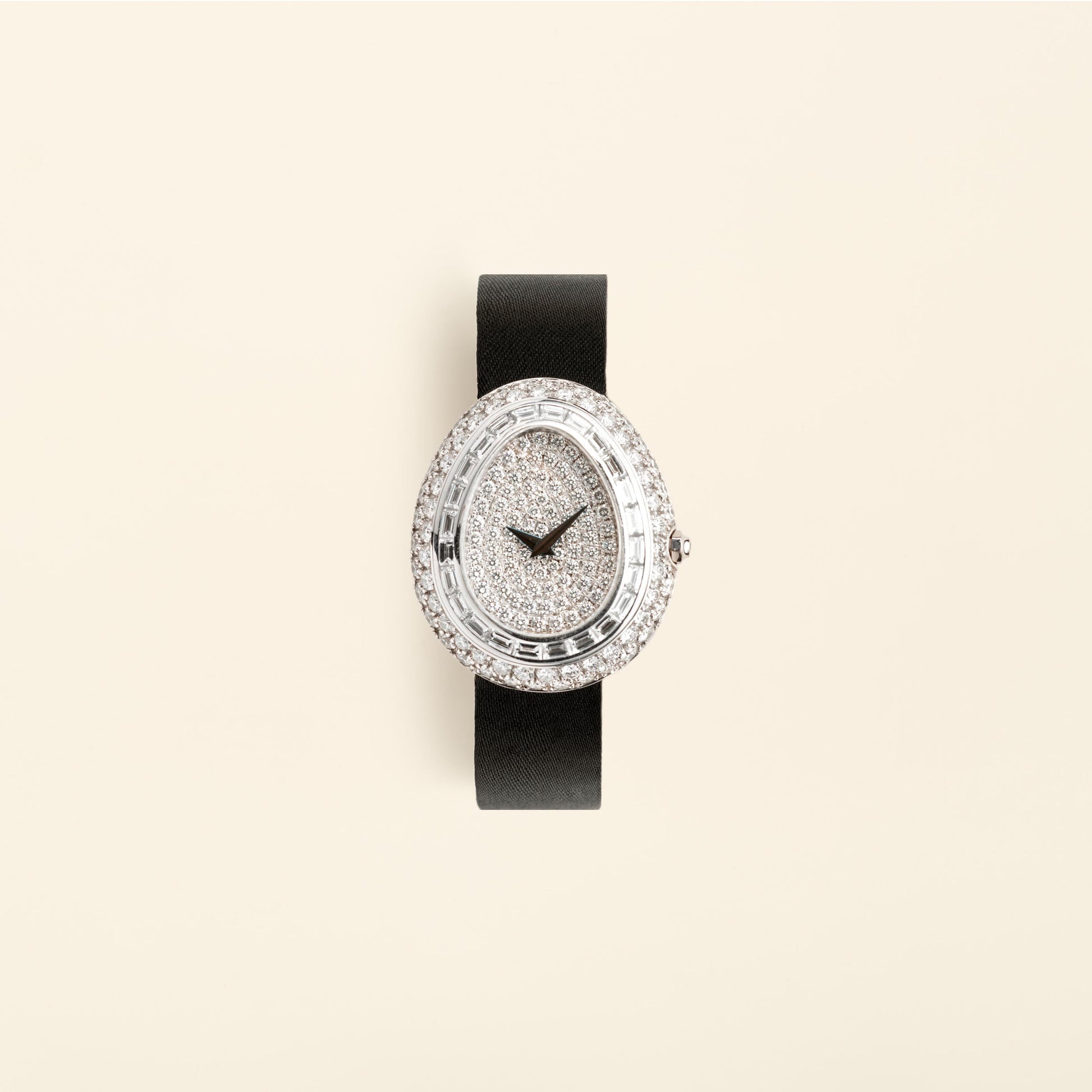 Full dial paved Imperial cased paved with 151 diamonds (3,16 ct) and 26 baguettes diamonds (1,43 ct)