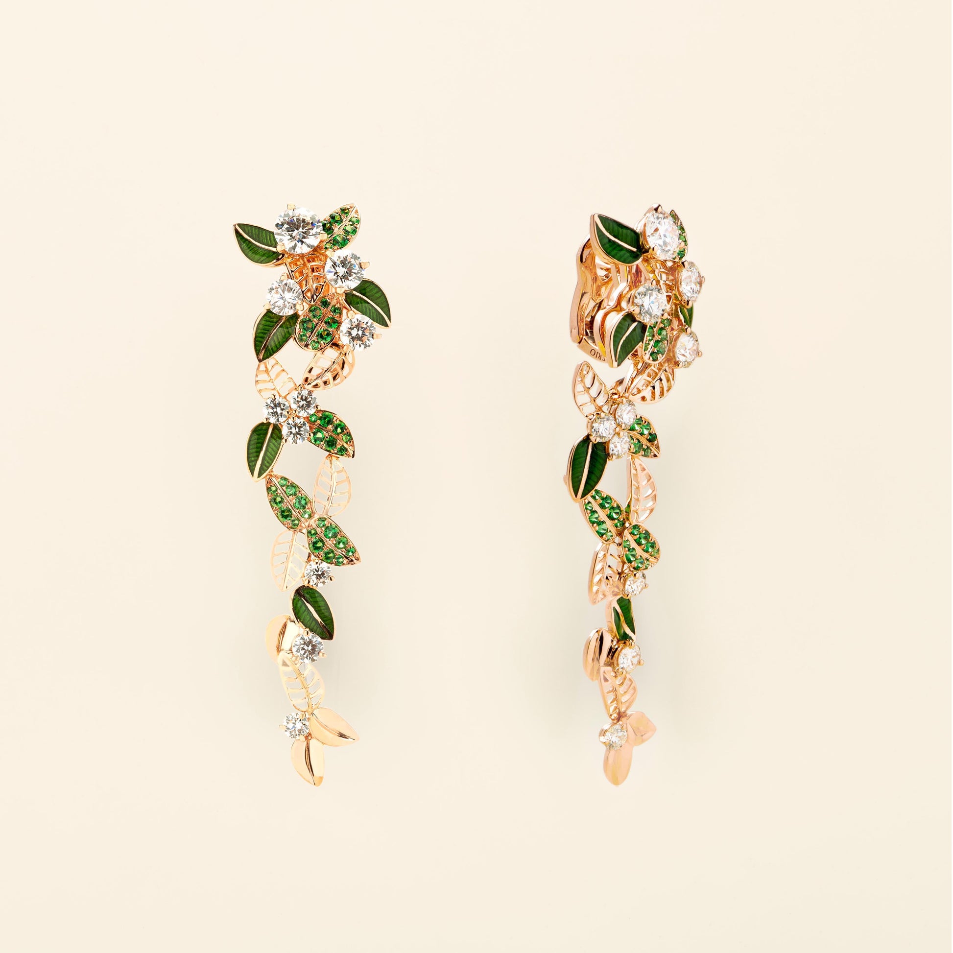 Foglio earrings, from the Isola Madre collection in 18k pink gold, set with tsavorites and diamonds with "Guilloché" green enamel.